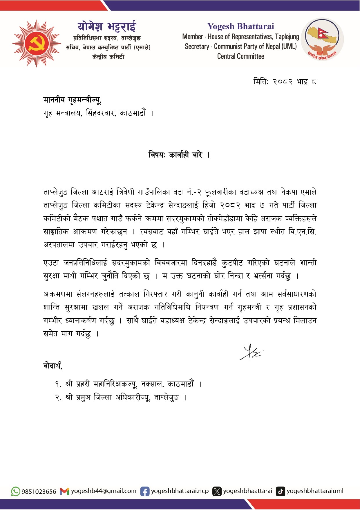 काठमाडौं । नेकपा (एमाले) का सचिव तथा ताप्लेजुङका सांसद योगेश भट्टराईले आठराई गाउँपालिका–२ का वडाध्यक्ष टेकेन्द्र सेन्दाङमाथि आक्रमण गर्नेहरूलाई तत्काल कारबाही गर्न माग गरेका छन्।