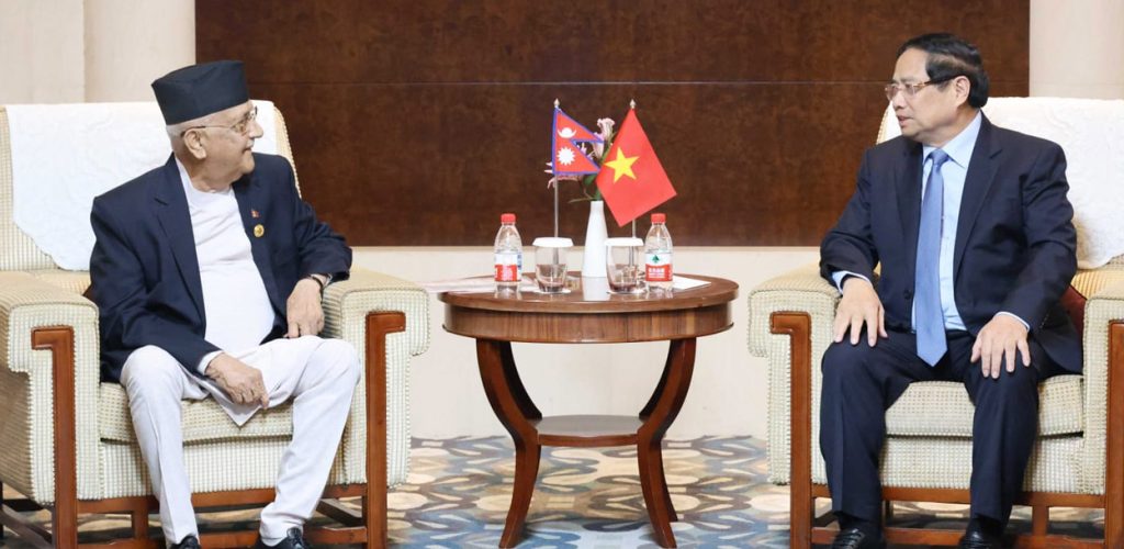 काठमाडौं। प्रधानमन्त्री केपी शर्मा ओली र भियतनामका प्रधानमन्त्री फाम मिन चिङबीच सोमबार चीनको थियानजिनमा द्विपक्षीय भेटवार्ता भएको छ। प्रधानमन्त्रीको सचिवालयले भेटवार्ता सम्पन्न भएको जानकारी दिएको छ।