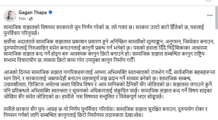 काठमाडौं । नेपाली कांग्रेसका महामन्त्री तथा प्रतिनिधि सभा सदस्य गगन थापाले सामाजिक सञ्जाल बन्द गर्ने सरकारको निर्णयलाई गलत ठहर गरेका छन्।