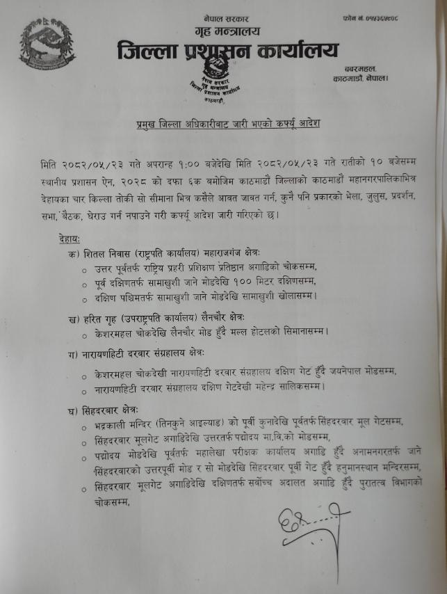 पहिले बानेश्वर वरिपरि मात्र लागू भएको कर्फ्यु अब सिंहदरबार क्षेत्र, राष्ट्रपति कार्यालय शीतलनिवास, उपराष्ट्रपति कार्यालय र नारायणहिटी क्षेत्रमा पनि लागू गरिएको छ। प्रशासनका अनुसार आन्दोलन थप उग्र बन्दै गएपछि सुरक्षा व्यवस्थालाई सुदृढ पार्न यस्तो कदम उठाइएको हो।