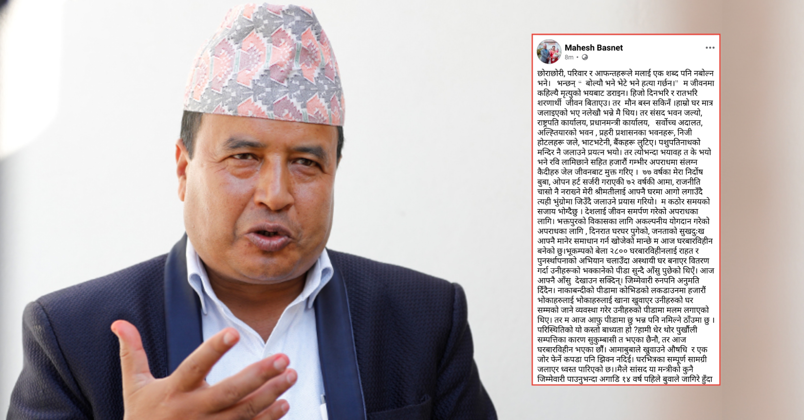 काठमाडौं । नेकपा (एमाले) का नेता तथा पूर्वमन्त्री महेश बस्नेतले आफ्नै घर जलाईएको पीडादायी प्रसंग सामाजिक सञ्जालमार्फत सार्वजनिक गरेका छन्। उनले आफ्नो बुबाआमा, पत्नी र परिवारसहित कठिन परिस्थितिबाट गुज्रनु परेको उल्लेख गर्दै “देशका लागि समर्पणको सजाय घरबार विहीन भएर पाएको छु” भनेका छन्।