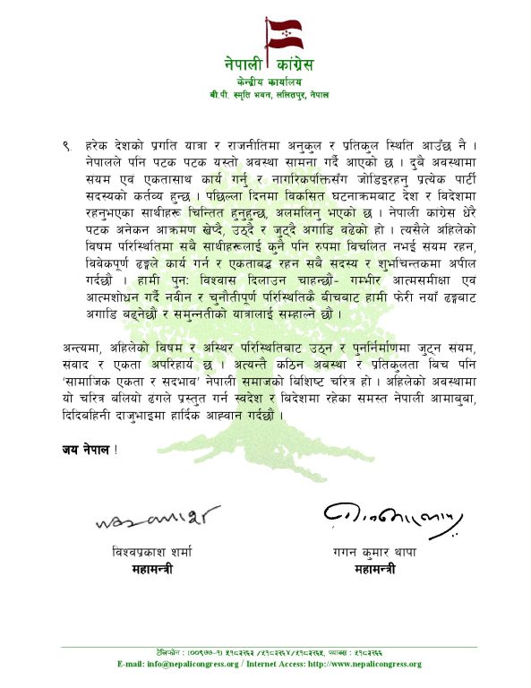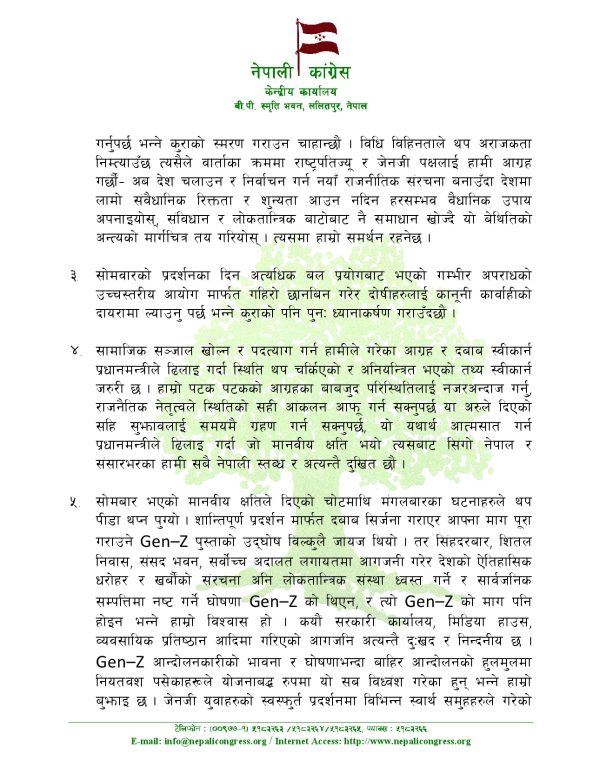कांग्रेसले जेनजी पुस्ताको भावनालाई सम्मान गर्दै त्यसै अनुरूप निष्कर्षमा पुग्नुपर्नेमा जोड दिएको छ। तर, त्यसका लागि संविधानले तोकेको वैधानिक मार्गबाट मात्र अघि बढ्न सकिने र सकिनुपर्ने स्पष्ट पारेको छ।