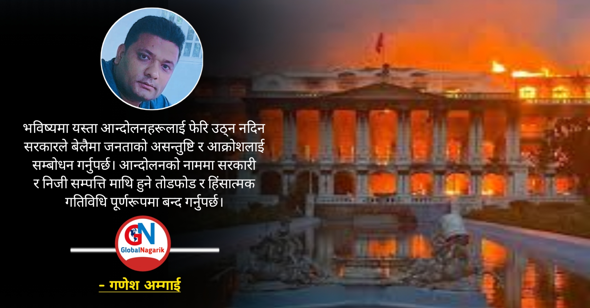 साथै, भौतिक संरचना, सार्वजनिक सम्पत्ति र सरकारी भवनको पुनर्निर्माण तत्काल गर्नुपर्छ। सम्बन्धित निकायहरूले जिम्मेवार व्यक्तिहरूको पहिचान गरी सुधारात्मक कदम चाल्नु आवश्यक छ। घाइतेको स्वास्थ्य लाभ सुनिश्चित गर्नु र मृतक परिवारप्रति हार्दिक श्रद्धाञ्जली व्यक्त गर्नु सामाजिक सद्भाव र राष्ट्रिय एकतालाई मजबुत बनाउँछ। कानूनी कारबाही, पुनर्निर्माण, स्वास्थ्य तथा सामाजिक पहल र सर्वपक्षीय सहकार्यलाई एकसाथ अघि बढाउँदा मात्र दीर्घकालीन स्थायित्व र राष्ट्रिय सुरक्षा सुनिश्चित गर्न सकिन्छ। यसका लागि प्रशासनिक दक्षता, सुरक्षा रणनीति र युवा सहभागितालाई सुदृढ गर्नु अत्यन्त महत्वपूर्ण छ। भ्रष्टाचार र व्यवस्थागत कमजोरीमा संलग्न व्यक्तिहरूलाई कानूनी कारबाही गर्न आवश्यक छ। राजनीतिक निर्णयहरू दलगत पूर्वाग्रहबाट बाहिर, निष्पक्ष र समावेशी दृष्टिकोणबाट हुनुपर्छ। कांग्रेस, नेकपा एमाले र माओवादीलाई बेवास्ता गर्नु जोखिमपूर्ण हुनेछ। सबै सर्वदलीय र सर्वपक्षीय टोलीको संयोजन अनिवार्य छ।