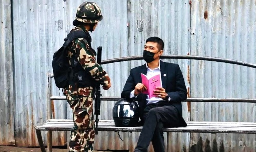 काठमाडौं । बिहीबार माइतीघर मण्डलामा संविधान हातमा लिएर शान्तिपूर्वक बसिरहेका अधिवक्ता राजु बम्जनको दृश्य सामाजिक सञ्जालमा भाइरल बनेको छ। उनी कर्फ्यू लागू हुनु अघि नै त्यहाँ पुगेका थिए र सेनाको कडाइबीच संविधान पढिरहेका तस्बिरले व्यापक ध्यान खिचेको हो।