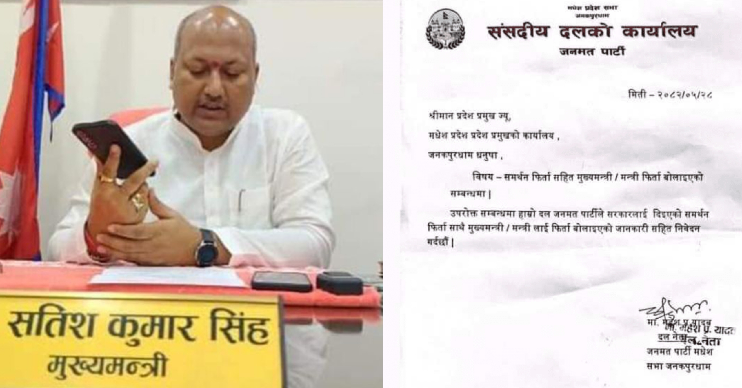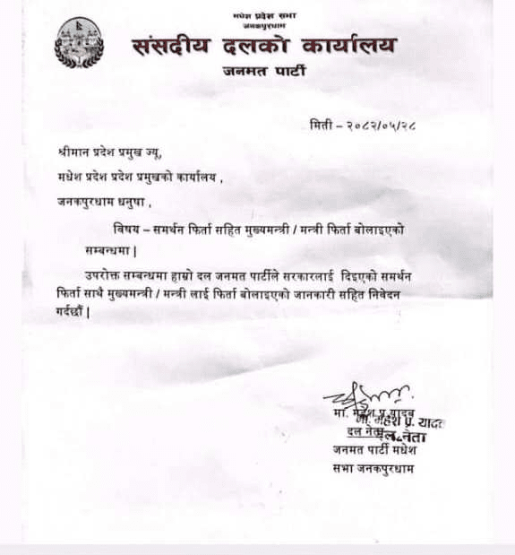 जनमत पार्टी संसदीय दलका नेता महेशप्रसाद यादवले आज मधेस प्रदेश प्रमुखलाई पत्र पठाउँदै समर्थन फिर्ता लिएको जानकारी गराएका हुन् ।