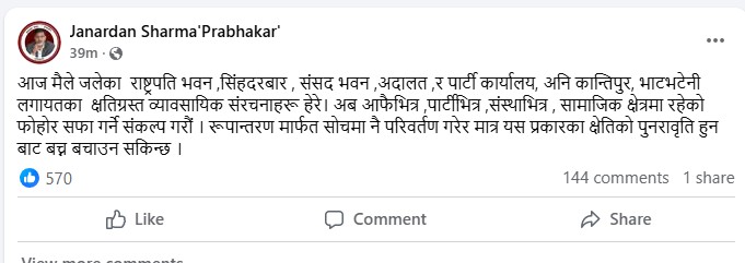 आइतबार फेसबुकमा आफ्नो स्टाटस मार्फत उनले लेखेका छन्, ‘आफैँभित्र, पार्टीभित्र, संस्थाभित्र र सामाजिक क्षेत्रमा रहेको फोहोर सफा गर्ने सङ्कल्प गरौँ। केवल रूपान्तरणमार्फत सोचमा परिवर्तन ल्याएर मात्र विगतका क्षतिको पुनरावृत्ति रोक्न सकिन्छ।’