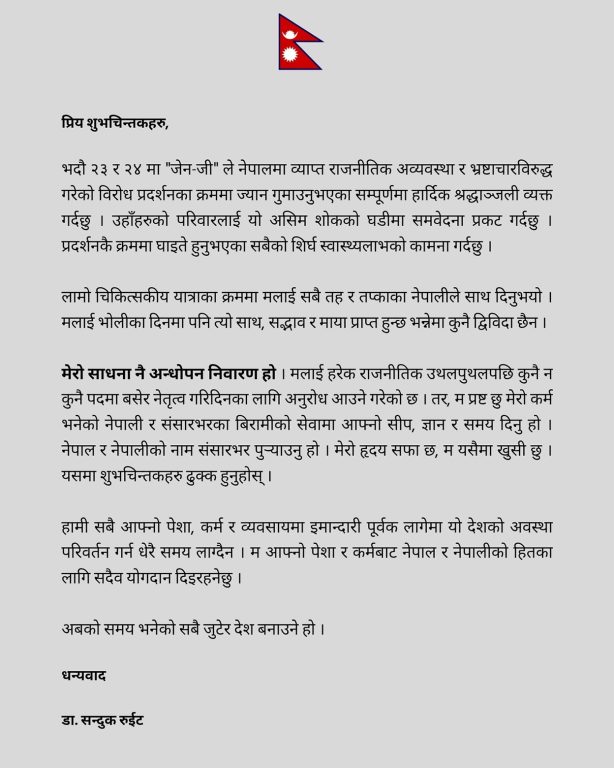 सोही दिन मन्त्रिपरिषद विस्तार भएको अवसरमा जारी गरेको विज्ञप्तिमा डा. रुइतले भनेका छन्, ‘हरेक राजनीतिक उथलपुथलपछि पदका लागि अनुरोध आउँछ, तर म प्रष्ट छु—मेरो कर्म भनेको नेपाली र विदेशका बिरामीलाई सेवा गर्नु, आफ्नो ज्ञान, सीप र समय दिने, र नेपाल तथा नेपालीको नाम अन्तर्राष्ट्रिय स्तरमा उजागर गर्नु हो।’