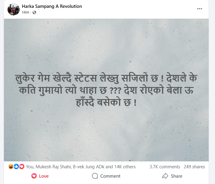 साम्पाङले सोमबार फेसबुकमा स्टाटस लेख्दै शाहलाई लक्षित गर्दै भनेका छन्, ‘लुकेर गेम खेल्दै स्टाटस लेख्नु सजिलो छ। देशले के–कति गुमायो, त्यो थाहा छ? देश रोइरहेको बेला ऊ हाँस्दै बसेको छ।’