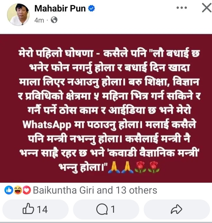 ‘मलाई कसैले मन्त्री नभन्नुहोला। यदि कसैलाई मन्त्री भन्नै मन छ भने “कबाडी वैज्ञानिक मन्त्री, भन्नुहोस्,’ उनले लेखेका छन्।
