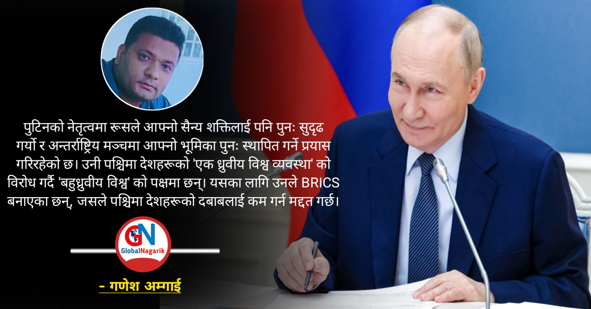 पुटिनको नेतृत्वमा रूसले आफ्नो सैन्य शक्तिलाई पनि पुनः सुदृढ गर्यो र अन्तर्राष्ट्रिय मञ्चमा आफ्नो भूमिका पुनः स्थापित गर्ने प्रयास गरिरहेको छ। उनी पश्चिमा देशहरूको ‘एक ध्रुवीय विश्व व्यवस्था’ को विरोध गर्दै ‘बहुध्रुवीय विश्व’ को पक्षमा छन्। यसका लागि उनले BRICS जस्ता संगठनहरू बनाएका छन्, जसले पश्चिमा देशहरूको दबाबलाई कम गर्न मद्दत गर्छ।