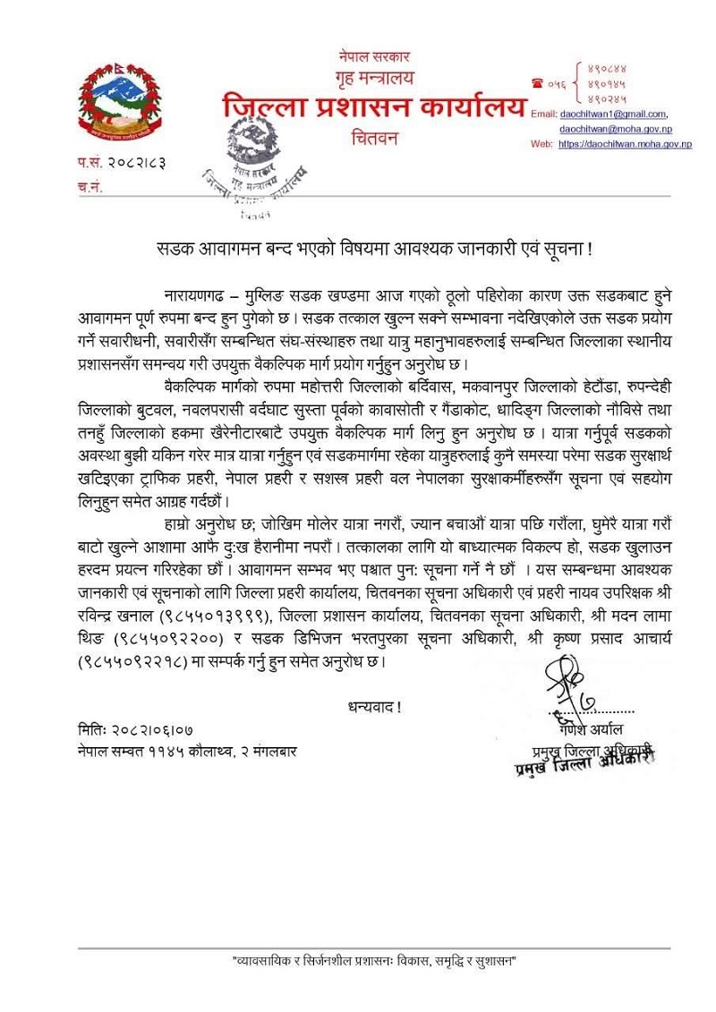 सडक तत्काल नखुल्ने भएकाले जिल्ला प्रशासन कार्यालय, चितवनले यात्रु तथा सवारी चालकहरूलाई वैकल्पिक मार्ग प्रयोग गर्न आग्रह गरेको छ।