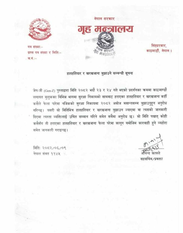 काठमाडौं । गृह मन्त्रालयले भदौ २३ र २४ गतेको प्रदर्शनका क्रममा काठमाडौंसहित देशका विभिन्न स्थानबाट हराएका हतियार र खरखजाना फिर्ता गर्न आग्रह गरेको छ ।
