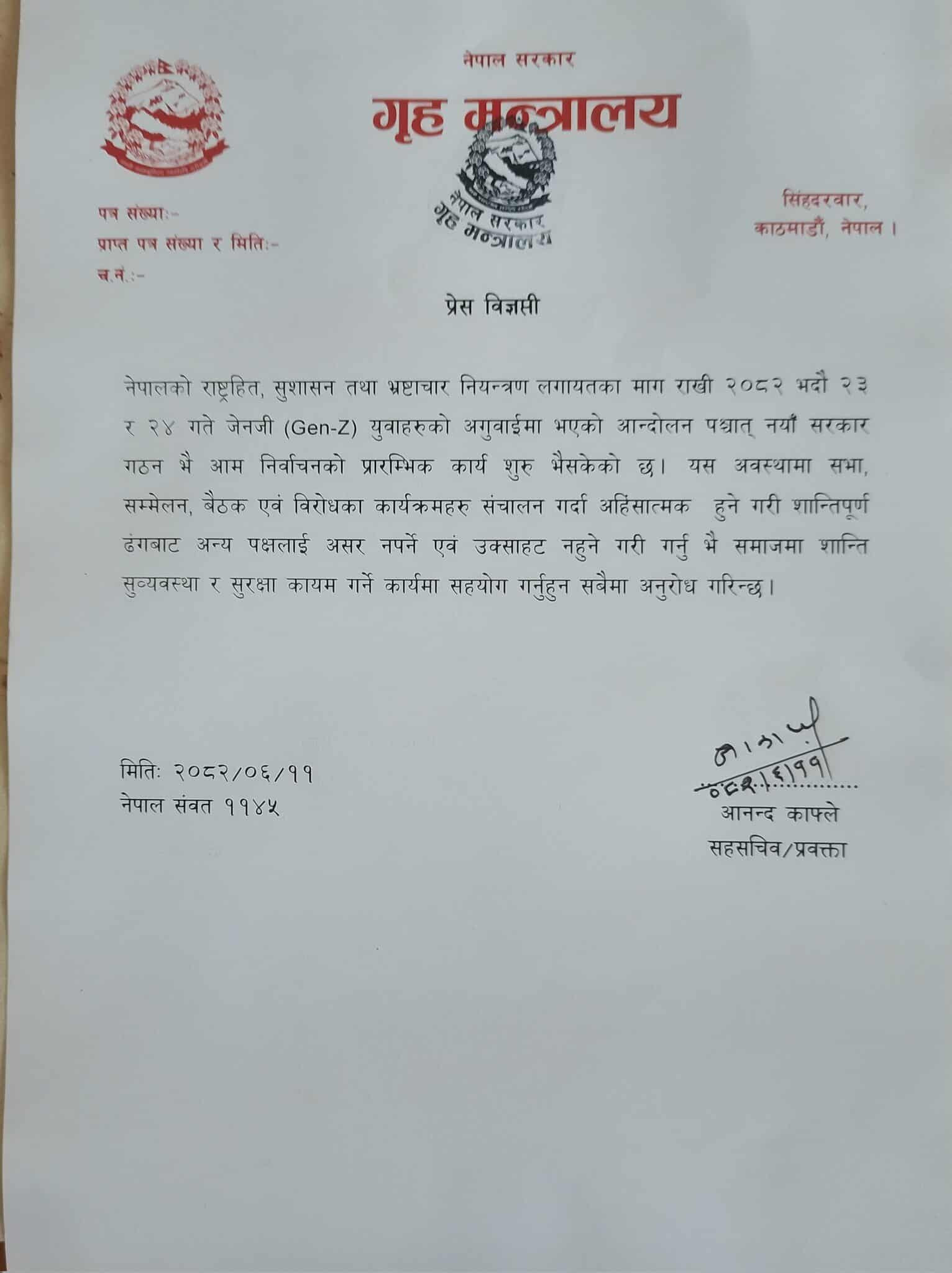 काठमाडौं । भदौ २३ र २४ गतेको आन्दोलनपछि देशमा नयाँ सरकार बढेको स्मरण गराउँदै गृह मन्त्रालयले अन्य पक्षलाई नउक्साउने गरी सभा सम्मेलन गर्न आग्रह गरेको छ।