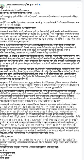 पछिल्ल्ला वर्षहरूमा जनताले अपेक्षा गरेको आशाभन्दा बढी निराशा अनुभव गर्नुपरेको बताउँदै नेता शर्माले नेपाली काँग्रेसले यथार्थलाई लुकाउने प्रयास नगरेर बरु आत्मसमीक्षाको साहसका साथ सम्पूर्ण नेपाली जनसमुदाय सामु विनम्रतापूर्वक क्षमा याचना मागेर सत्यप्रतिको निष्ठा र आत्मालोचनाको इमानदार प्रमाण दिने बताएका छन् ।