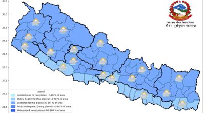 असोज १९ गते कोशी, मधेश, बागमती, गण्डकी र लुम्बिनी प्रदेशका धेरै स्थानमा तथा बाँकी प्रदेशका थोरै स्थानमा हल्कादेखि मध्यम वर्षाको सम्भावना रहेको छ । कोशी, मधेश, बागमती र गण्डकी प्रदेशका थोरै स्थानमा भारीदेखि धेरै भारी वर्षा र एक–दुई स्थानमा अतिभारी वर्षाको सम्भावना रहेको विभागले जनाएको छ ।