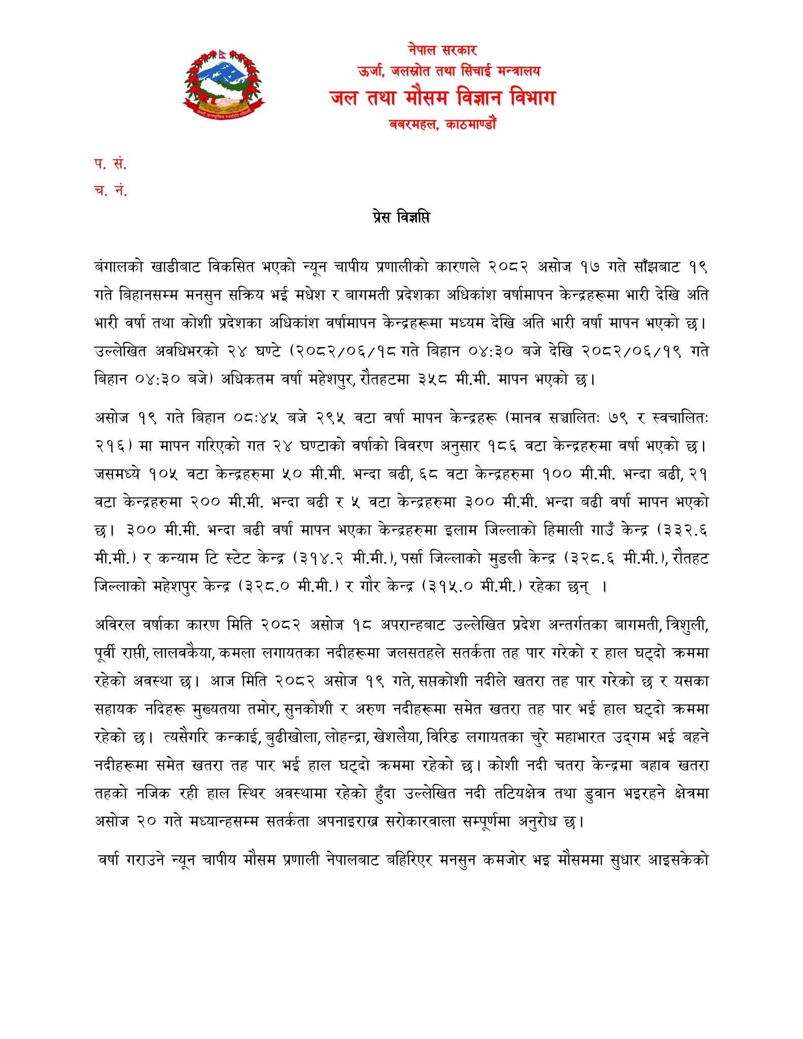 वर्षा गराउने न्यूनचापीय मौसम प्रणाली नेपालबाट बाहिरिएर मनसुन कमजोर भई मौसममा सुधार आइसकेको भए तापनि मनसुन वहिर्गनम भइनसकेको हालको अवस्थामा मनसुनजन्य प्रकोपबाट जोगिन तथा सचेत रहन विभागले विज्ञप्तिमार्फत आग्रह गरेको छ ।