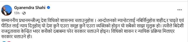 सांसद शाहीले सामाजिक सञ्जालमार्फत प्रधानमन्त्रीलाई सम्बोधन गर्दै भनेका छन्, ‘विदेशी राजदूतावास केन्द्रित भएर कसैको दबाबमा परेर सरकार चलाउने होइन। विधिको शासन र न्यायिक प्रक्रिया मिलाएर सरकार चलाउने हो।’