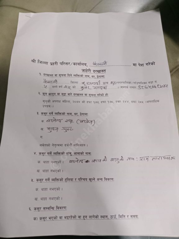अनेरास्ववियु कैलालीका अध्यक्ष कुवेर खड्काले बुधबार जिल्ला प्रहरी कार्यालय, कैलालीमा पुगेर बालेन र गुरुङविरुद्ध जाहेरी पेश गरेका हुन् ।