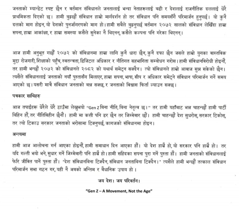 “हामी संविधानविरोधी होइनौं, तर परिवर्तनको पक्षधर हौं। संविधान जनताको हुनुपर्छ, नेताहरूको होइन,” वक्तव्यमा भनिएको छ।