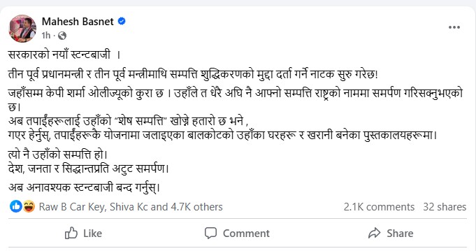 उनले लेखेका छन्, ‘सरकारको नयाँ स्टन्टबाजी: तीन पूर्वप्रधानमन्त्री र तीन पूर्वमन्त्रीमाथि सम्पत्ति शुद्धिकरणको नाटक सुरु भएको छ। जहाँसम्म केपी शर्मा ओलीको कुरा छ, उहाँले धेरै अघि नै आफ्नो सम्पत्ति राष्ट्रको नाममा समर्पण गरिसक्नुभएको छ। अब ‘शेष सम्पत्ति’ खोज्ने हतार छ भने, गएर हेर्नुस्—बालकोटमा जलाइएका उहाँका घरहरू र खरानी बनेका पुस्तकालयहरू नै उहाँको सम्पत्ति हो। देश, जनता र सिद्धान्तप्रति अटुट समर्पण। अब अनावश्यक स्टन्टबाजी बन्द गर्नुपर्छ।’