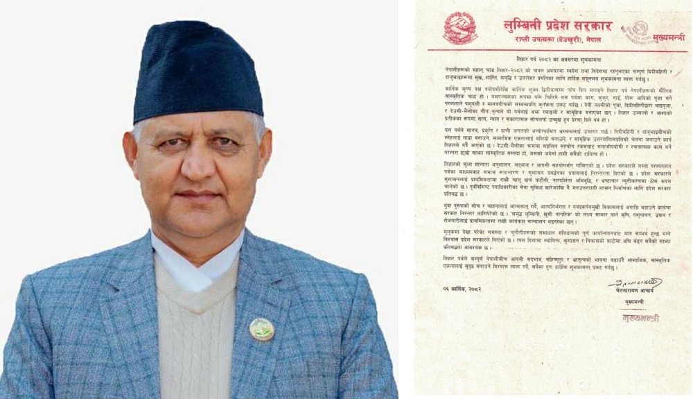 लुम्बिनी । लुम्बिनी प्रदेशका मुख्यमन्त्री चेतनारायण आचार्यले तिहार पर्वले सामाजिक एकता, सद्भाव र भ्रातृत्वको भावना बलियो बनाउन सहयोग गर्ने विश्वास व्यक्त गरेका छन् । तिहार पर्वका अवसरमा आज जारी गर्नुभएको शुभकामना सन्देशमा उनले सत्य, न्याय र सकारात्मक सोचतर्फ समाजलाई उन्मुख गराउने तिहारको मूल्य र सन्देशलाई आत्मसात् गर्न सबैलाई आग्रह गरेका हुन् ।