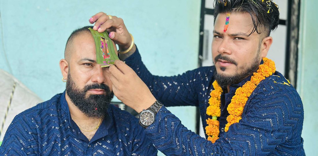 आज उहाँहरुले शुभसाइतमा एकापसमा टीका लगाउनुभएको हो । सुरुमा दाजु मदनले भाइ सुमनलाई पानी र तेलको धारो चुहाउँदै फेरो मार्नुभयो । भाइटीकाको प्रक्रियाअनुसार निधारमा सप्तरङ्गी टीका लगाएर उहाँले फूलको माला गलामा पहिराइदिनुभयो । भाइको शत्रु नास र दीर्घायुको कामना गर्दै ओखर फोर्नुभयो । त्यसपछि भाइ सुमनले दाजु मदनलाई भाइटीका लगाइदिनुभयो । विगत आठ वर्षदेखि मदन र सुमनले यसरी नै एक अर्कालाई टीका लगाएर भाइटीका मनाउँदै आउनुभएको छ । दिदीबहिनी नभएपछि आठ वर्षदेखि भाइटीका यसैगरी मनाउँदै आइरहेको दाजु मदनले बताउनुभयो । उहाँले भन्नुभयो, “विगतमा आफन्त दिदीबहिनीको हातबाट टीका थाप्दै आइरहेका थियौं । उहाँका आफ्नै दाजुभाइ विदेश गएपछि हामीलाई टीका लगाउन आउन छाड्नुभयो । हामी टीका थाप्न कुरिरहेका थियौं । नआएपछि मन खल्लो भो । त्यसपछि हामी दाजुभाइले नै भाइटीका गर्ने सोच बनाएर सुरु ग¥यौं ।
