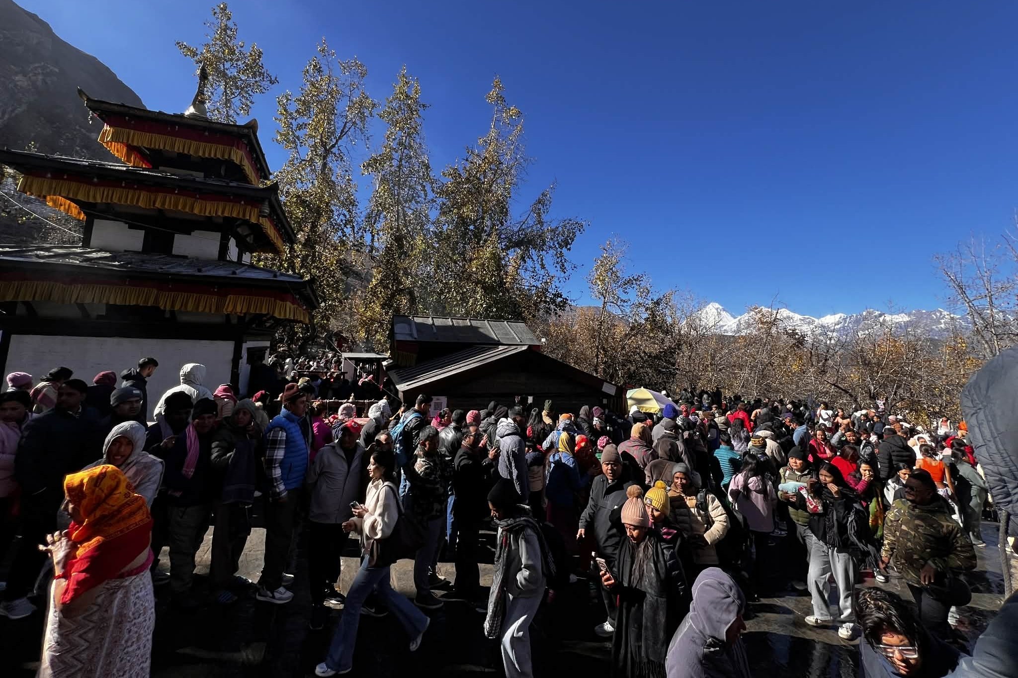 तिहारलगत्तै मुक्तिनाथमा दर्शनार्थीको सङ्ख्या अत्यधिक रुपमा वृद्धि भइरहेको मुक्तिनाथ विकास समितिका कोषाध्यक्ष प्रमेश गुरुङले जानकारी दिए । मुक्तिनाथमा आज बिहानैदेखि दर्शनार्थीको सङ्ख्याले परिसर पूरै खचाखच भरिएको कोषाध्यक्ष गुरुङको भनाइ छ । मन्दिरमा दर्शनार्थीको सहजताका लागि सुरक्षा निगरानी र लाइनबद्ध गराउन सुरक्षा निकायसँगै स्वंयसेवक खटाइएको कोषाध्यक्ष गुरुङले जनाए ।