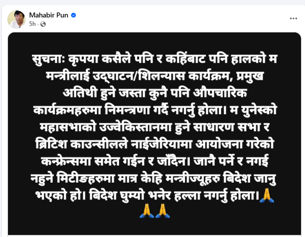 काठमाडाैं । शिक्षा, विज्ञान तथा प्रविधि मन्त्री महावीर पुनले आफूलाई कुनै पनि उद्घाटन, शिलान्यास वा प्रमुख अतिथिको रूपमा आमन्त्रण नगर्न आग्रह गरेका छन्। ‘कृपया कसैले पनि र कहीँबाट पर्नि उद्घाटन/शिलान्यास कार्यक्रम, प्रमुख अतिथि हुनेजस्ता कुनै पनि औपचारिक कार्यक्रमहरूमा निमन्त्रण गर्दै नगर्नु होला,’ सामाजिक सञ्जालमा मन्त्री पुनले लेखेका छन्।