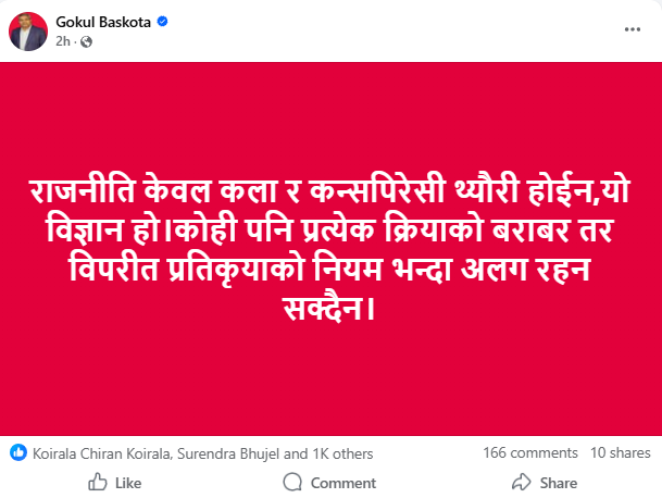 उनले शुक्रबार सामाजिक सञ्जाल फेसबुकमा भनेका छन्,‘राजनीति कुनै कला र कन्सपिरेसी थ्यौरी होइन। यो विज्ञान हो।’