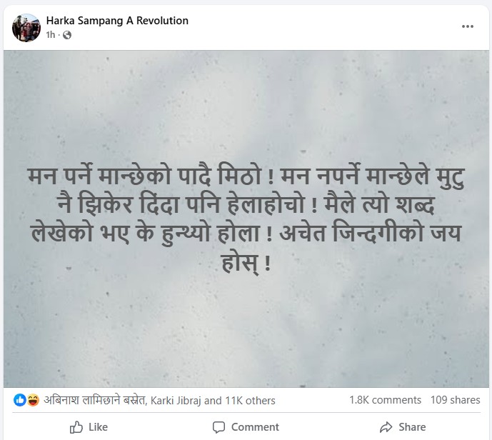 उनले लेखेका छन्, ‘मन पर्ने मान्छेको पादै मिठो! मन नपर्ने मान्छेले मुटु नै झिकेर दिँदा पनि हेलाहोचो! मैले त्यो शब्द लेखेको भए के हुन्थ्यो होला? अचेत जिन्दगीको जय होस्!’