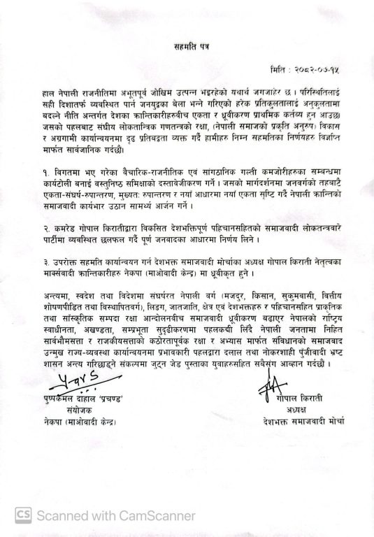 सहमति पत्रमा माओवादी केन्द्रका अध्यक्ष पुष्पकमल दाहाल ‘प्रचण्ड’ र देशभक्त समाजवादी मोर्चाका अध्यक्ष गोपाल किरातीले हस्ताक्षर गरेका छन् ।