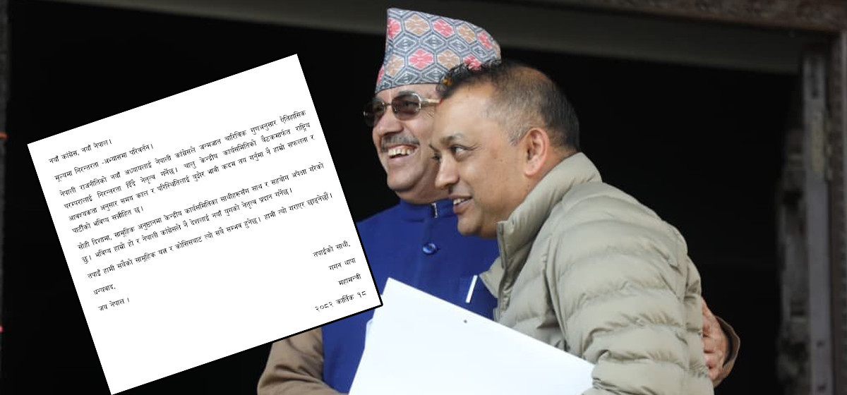 मंगलबार सानेपामा जारी केन्द्रीय समिति बैठकमा लिखित रूपमा प्रस्तुत प्रस्तावमार्फत महामन्त्री थापाले भनेका छन्, ‘अब कांग्रेसले पुनः प्रमाणित गर्नुपर्छ कि हामी पद वा सत्ताका लागि होइन, देश र सुधारका लागि लड्ने पार्टी हौं।’