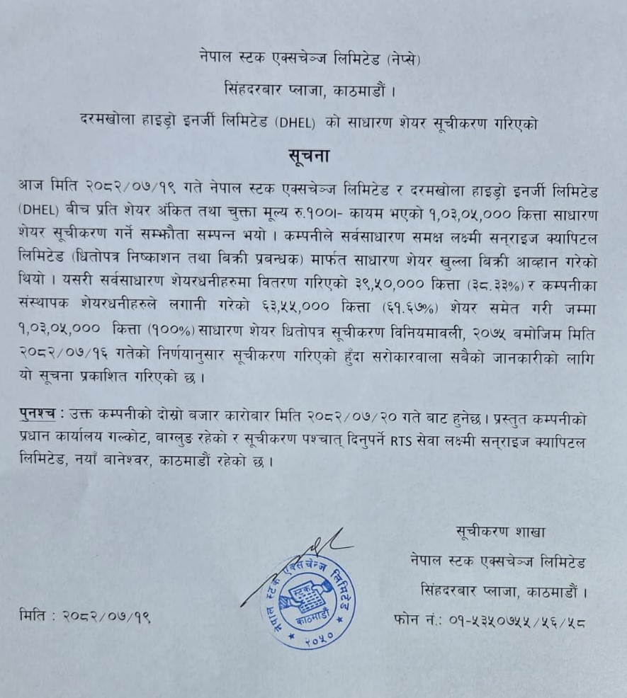 काठमाडौं ।  नेपाल स्टक एक्सचेञ्ज लिमिटेड (नेप्से) ले दरमखोला हाइड्रो इञ्जिनियरीङ लिमिटेड (DHEL) को साधारण शेयर सूचीकृत गरेको छ।