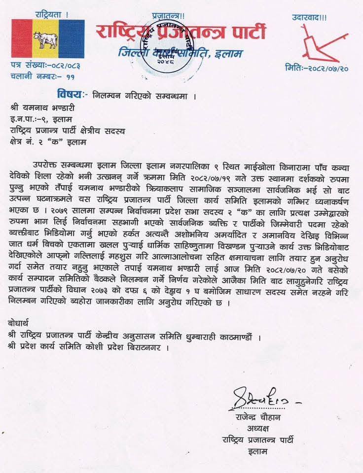 यस निर्णयको जानकारी राप्रपाको केन्द्रीय अनुशासन समिति र कोशी प्रदेश कार्यसमितिलाई समेत पठाइएको पत्रमा उल्लेख छ।