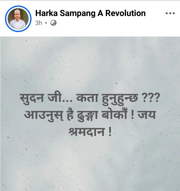 उनले सामाजिक सञ्जालमा लेखेका छन्, ‘सुदन जी… कता हुनुहुन्छ??? आउनुस् है ढुङ्गा बोकौँ! जय श्रमदान!’