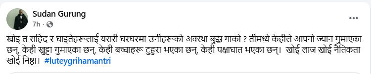 ‘खोइ त सहिद र घाइतेहरूलाई यसरी घरघरमा उनीहरूको अवस्था बुझ्न गाको? तीमध्ये केहीले आफ्नो ज्यान गुमाएका छन्, केही खुट्टा गुमाएका छन्, केही बच्चाहरू टुहुरा भएका छन्, केही पक्षाघात भएका छन्,’ उनले सामाजिक सञ्जालाम लेखेका छन्, ‘खोई लाज खोई नैतिकता खोई निष्ठा।’