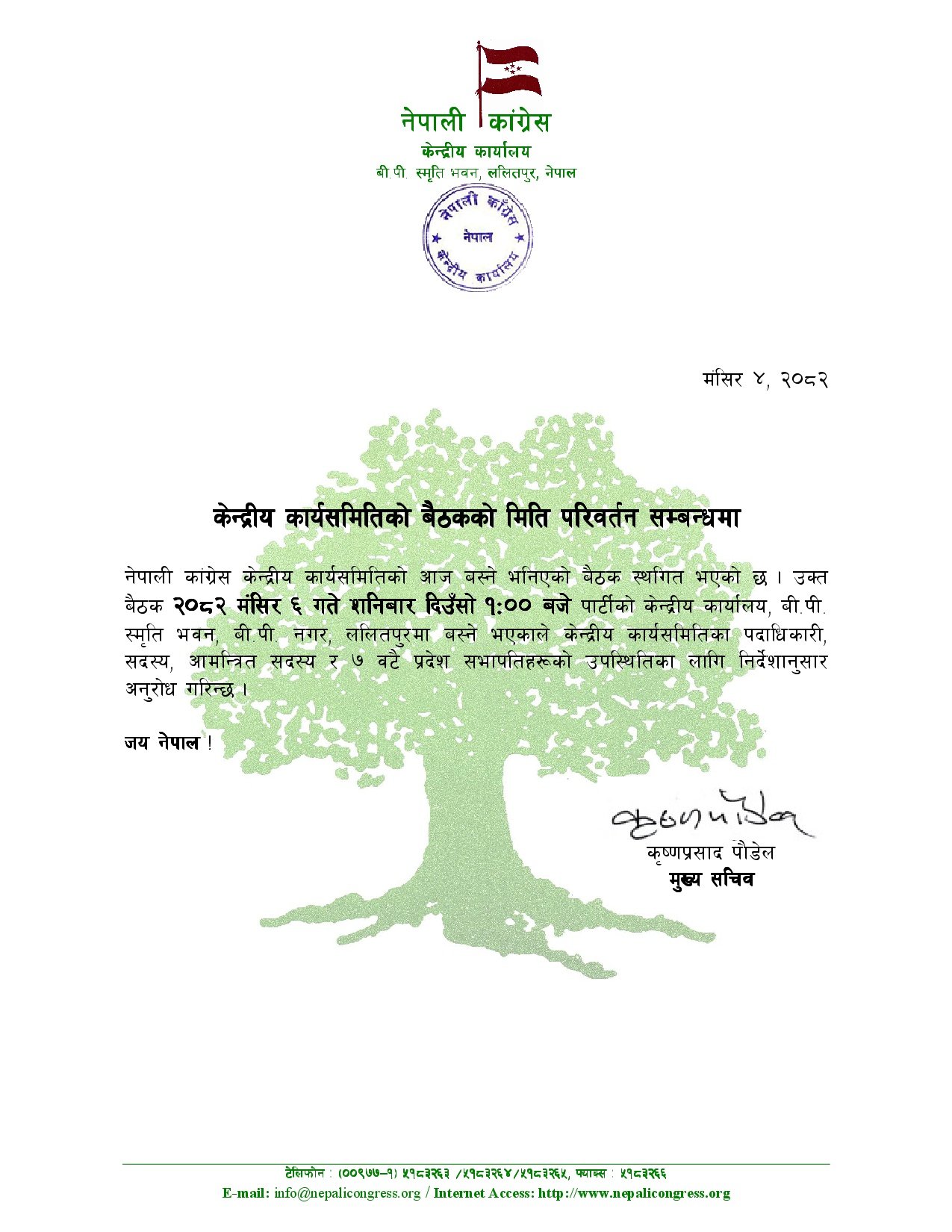 पार्टी केन्द्रीय कार्यालयका मुख्यसचिव कृष्णप्रसाद पौडेलले नयाँ सूचना जारी गर्दै बैठक मंसिर ६ गते, शनिबार दिउँसो १ बजे बीपी स्मृति भवन, बीपी नगर, ललितपुरमा बस्ने जानकारी दिएका छन्। उनले पदाधिकारी, सदस्य, आमन्त्रित सदस्य तथा सातै प्रदेश सभापतिलाई तोकिएको समयमा उपस्थित हुन अनुरोध गरेका छन्।