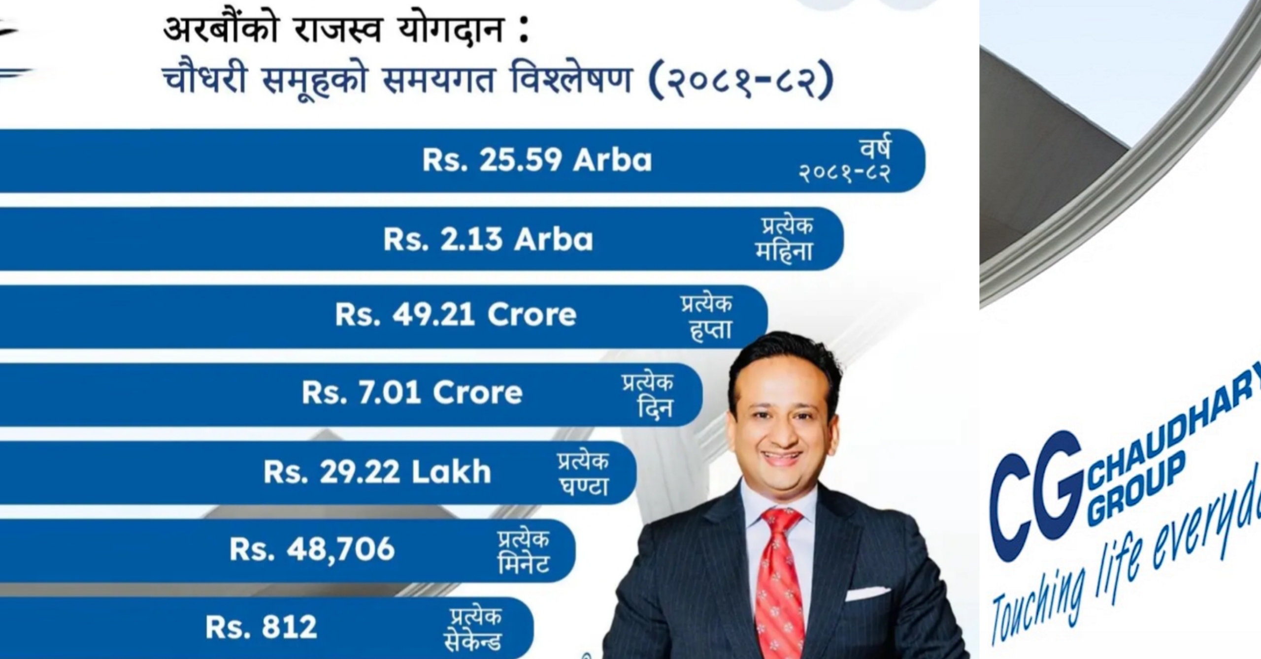 यससंगै गत पाँच वर्षमा चौधरी ग्रुपले सरकारको ढुकुटीमा ९२ अर्ब २६ करोड रुपैयाँ राजस्व दाखिला गरेको छ । कमजोर आर्थिक गतिविधि, आयात-निर्भर बजार, नीतिगत अस्थिरता, बजारको मनोवैज्ञानिक डर तथा निजी लगानीमा आएका बाधाका बाबजुद पनि चौधरी ग्रुपले राजस्वमा निरन्तर योगदान दिँदै आएको छ।