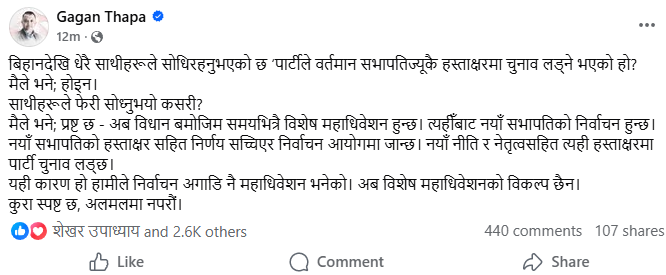 काठमाडौं । पार्टीभित्र नेतृत्व परिवर्तन हुने संकेत दिँदै गगन थापाले आगामी चुनाव वर्तमान सभापतिको हस्ताक्षरमा नलडिने स्पष्ट गरेका छन्। बिहानदेखि उठेका प्रश्नहरूबीच उनले विधानअनुसार अब निर्धारित समयभित्रै विशेष महाधिवेशन अनिवार्य रूपमा हुने बताएका छन्।