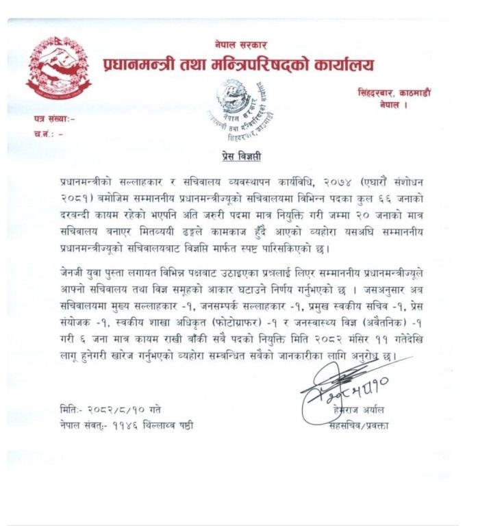 प्रधानमन्त्री तथा मन्त्रिपरिषद्को कार्यालयले बुधबार प्रेस विज्ञप्ति जारी गर्दै सचिवालयमा हाल रेहका २० जनामध्ये ६ जनामात्रै राखेर अन्य १४ जनालाई हटाउने निर्णय गरेकी हुन् । निर्णय भोलि(मंसिर ११) देखि लागु हुजे जारी विज्ञप्तिमा उल्लेख गरिएको छ ।