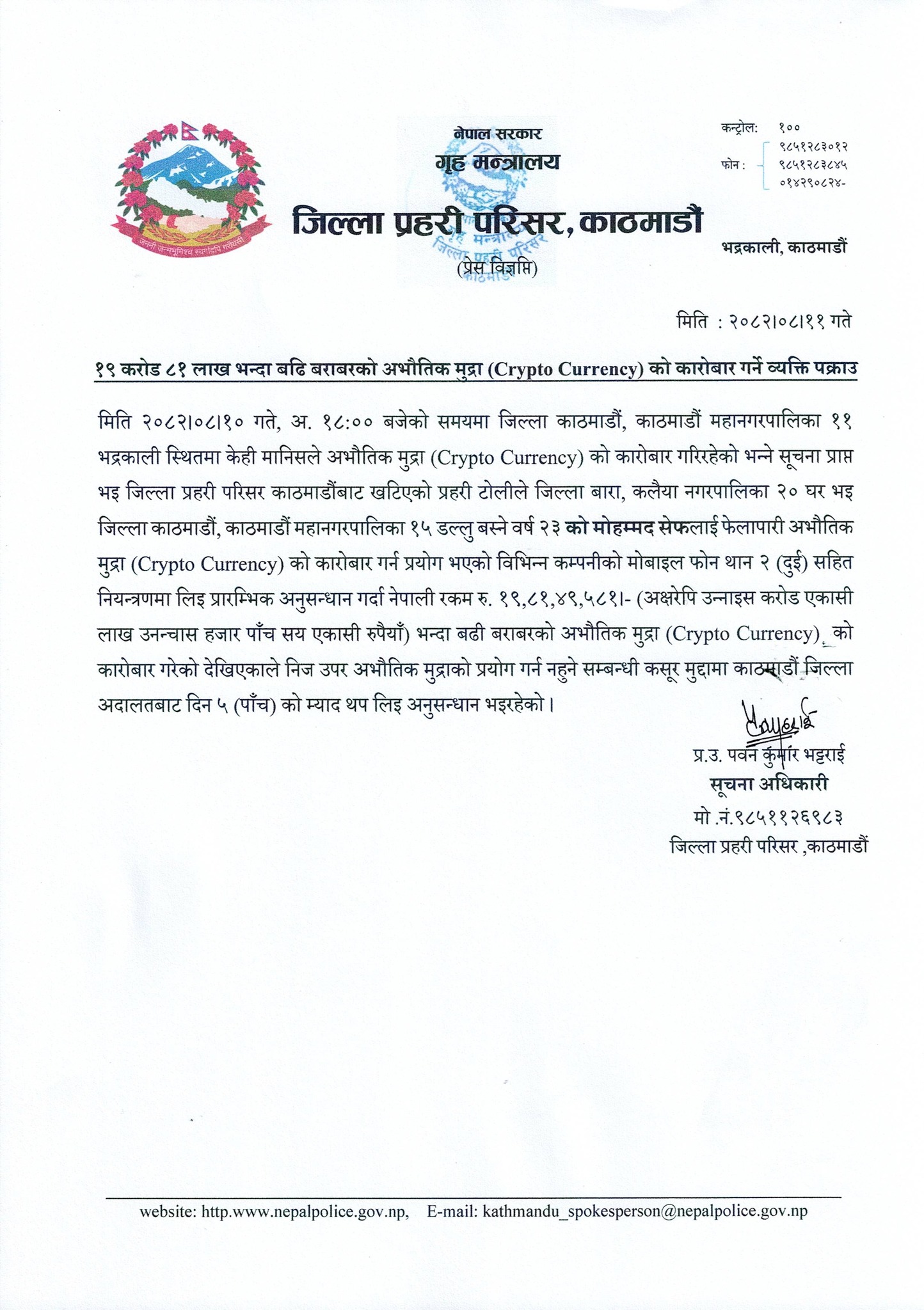 जिल्ला प्रहरी परिसर काठमाडौंको टोलीले मङ्गलबार साँझ ८ बजे २२ वर्षीय मोहम्मद रफिकलाई नियन्त्रणमा लिएको हो। प्रहरीले उनको साथबाट विभिन्न कम्पनीका मोबाइल एप तथा (डिभाइस) मार्फत भएको करोडौँको अवैध क्रिप्टो कारोबारका प्रमाण फेला पारेको जनाएको छ।