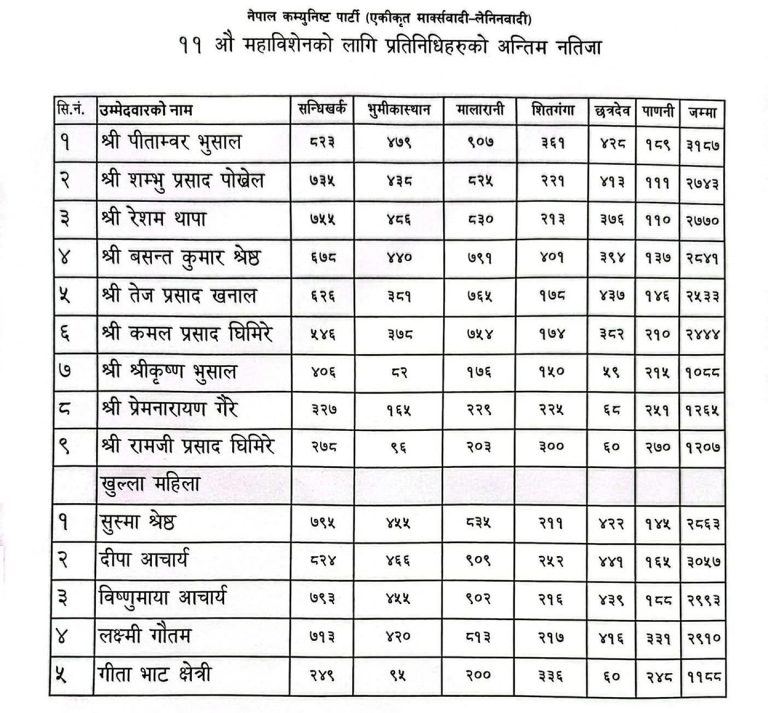 यसैगरी बसन्त कुमार श्रेष्ठले २ हजार ८४१, रेशम थापाले २ हजार ७७०, शम्भु प्रसाद पोख्रेलले २ हजार ७४३, तेज प्रसाद खनालले २ हजार ५३३ र कमलप्रसाद घिमिरेले २ हजार ४४४ मत ल्याउँदै प्रतिनिधिमा निर्वाचित भए।