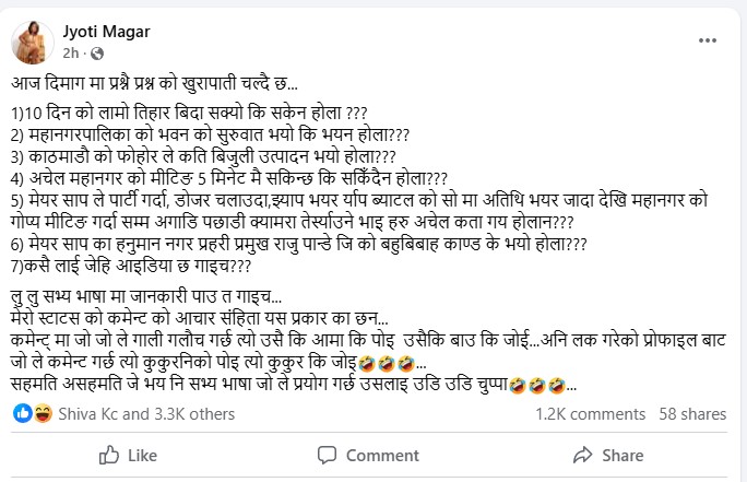 काठमाडाैं । गायिका ज्योति मगरले काठमाडौं महानगरका मेयर बालेन शाह र उनका समर्थकलाई लक्षित गर्दै सामाजिक सञ्जालमार्फत सातवटा प्रश्न सार्वजनिक गरेकी छन्। उनले विगत केही समयदेखि महानगरको काम–कारबाही विवादमा परिरहँदा उठेका विभिन्न प्रसंगलाई उल्लेख गर्दै मेयरसमक्ष जवाफ मागेकी हुन्।