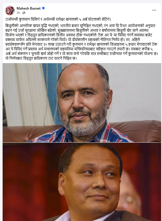 मंगलबार सामाजिक सञ्जालमार्फत उनले ५ हजार मेगावाट विद्युत् खरिद सम्झौता (पीपीए)**का नाममा करिब ५ अर्ब रुपैयाँको आर्थिक चलखेल गर्ने प्रयास भएको दाबी गरे।