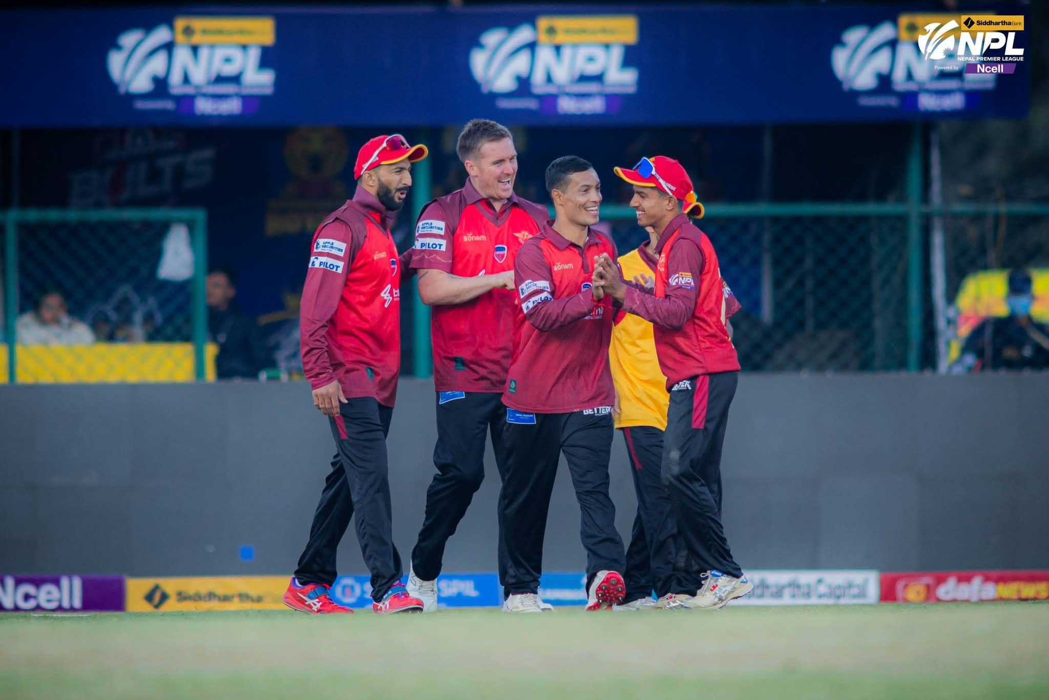अल्पेश रामजानी ३३, डेविड मलान ५, अर्जुन साउद १, रवि बोपारा १, सैफ जैइव १७, कप्तान कुशल मल्ल २३ रनमा आउट भए । कमलसिंह ऐरी २ रनमा अविजित रहे । बलिङमा पोखराका धनन्जय लक्षनले सर्वाधिक ३ विकेट लिए । विपिन खत्री, रोहित चन्द र किरण ठगुन्नाले एकएक विकेट लिए ।