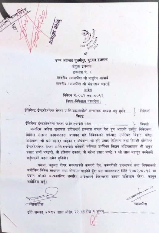 काठमाडौं । उच्च अदालत तुलसीपुर, बुटवल इजलासले ईलिगेन्ट इन्टरटेनमेन्ट सेन्टर प्रा.लि. काे आन्तरिक विवादमा बहुमत शेयरधनीको पक्षलाई कानुनी रूपमा मान्यता दिँदै मिति २०८२/०८/१६ मा जारी गरिएको अल्पकालीन अन्तरिम आदेशलाई खारेज गरेको छ।