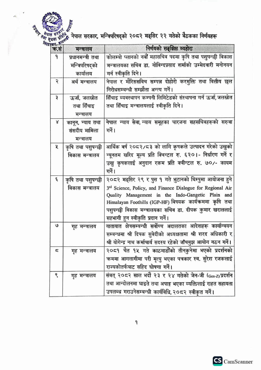 मंसिर २२ गते बसेको मन्त्रिपरिषद् बैठकले कृषकले उत्पादन गरेको उखुको न्यूनतम खरिद मूल्य प्रति क्विन्टल ६२० रुपैयाँ निर्धारण गर्ने र उखु कृषकलाई अनुदान रकम प्रति क्विन्टल ७० रुपैयाँ कायम गर्ने निर्णय गरेको छ ।