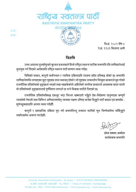 विज्ञप्तिमा भनिएको छ, ‘सम्बन्धित कानुनी र प्रशासनिक प्रक्रिया पूरा गरी सभापति रवि लामिछाने पार्टीको मूल जिम्मेवारीमा फर्किनुहुने व्यहोरा अवगत गराइन्छ।’