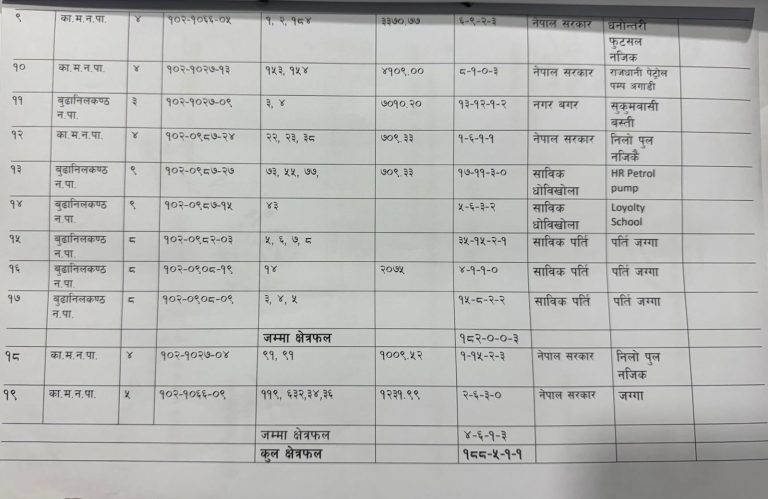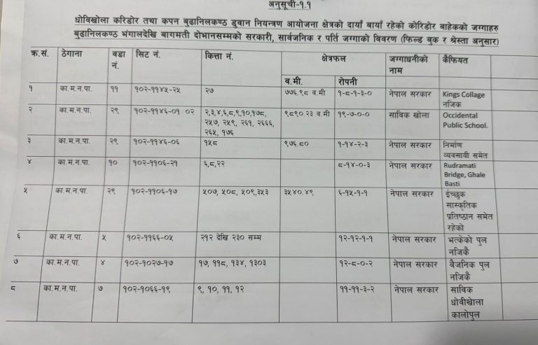 कार्यालयको आन्तरिक प्रतिवेदनअनुसार बूढानीलकण्ठको भङ्गालदेखि बागमती दोभानसम्म करिब १२ किलोमिटर क्षेत्रभित्र झण्डै १ सय ८८ रोपनी सरकारी जग्गा अतिक्रमण भएको पाइएको छ । उक्त जग्गा खाली गराउने विषयमा अध्ययनका लागि शहरी विकास मन्त्रालयले उपसचिव महेश सिंहको संयोजकत्वमा अध्ययन समिति गठन गरेको थियो । समितिमा काठमाडौँ उपत्यका विकास प्राधिकरणका तर्फबाट डोरकाजी श्रेष्ठ र सर्वेक्षक शरद रिजाल सदस्य रहेका छन् ।