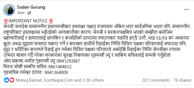 गुरुङका अनुसार भदौ २३ र २४ मा भएको आन्दोलनमा पक्राउ परेका तर अझै रिहा हुन नसकेका व्यक्तिहरूका परिवारले सिधै गृहमन्त्री ओमप्रकाश अर्याल, गृहसचिव रामेश्वर दंगाल र सचिव धिरज जोशीसँग सम्पर्क गर्न सकून् भन्ने उद्देश्यले नम्बर सार्वजनिक गरिएको हो।